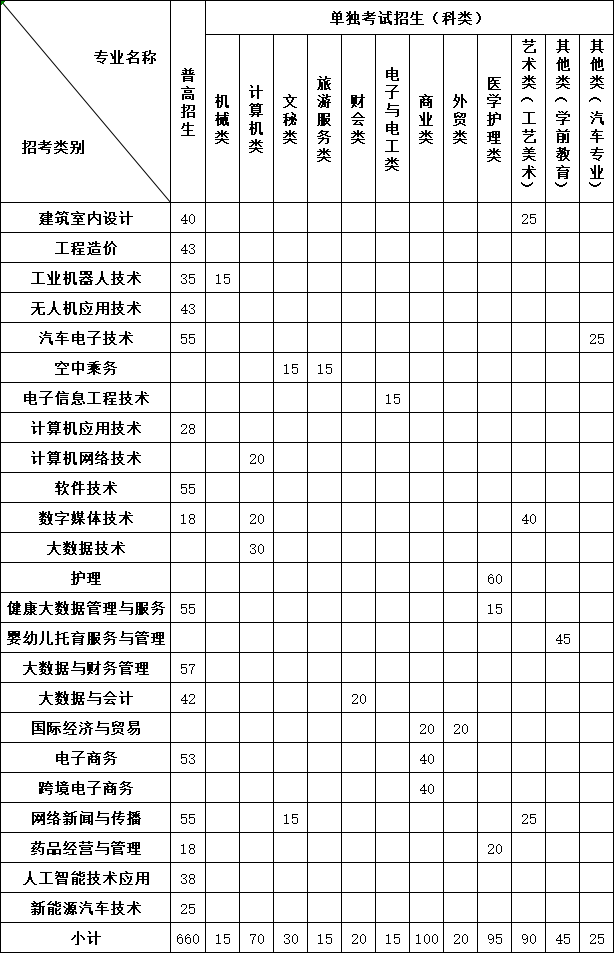 八条 招生专业、科类及计划。招生专业24个,招生计划1200名。其中面向普高招生考生计划660名,面向单独考试招生考生计划540名,学制均为三年,具体专业计划如下表: