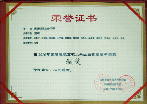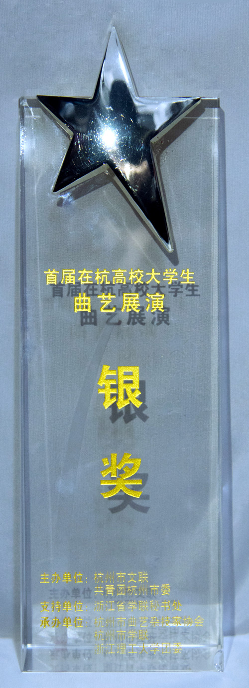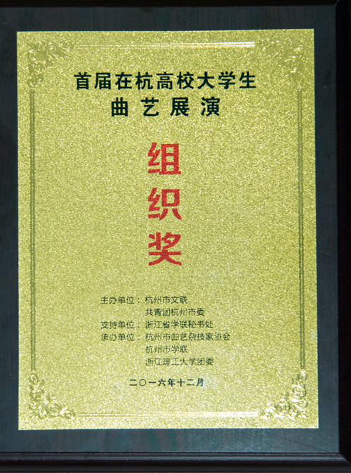 2016年12月,我院在由杭州市文联、共青团杭州市委主办的“首届在杭高校大学生曲艺展演”活动中获得“组织奖”。我院艺术团参赛作品《回声》获得“2016年首届在杭高校大学生曲艺展演银奖”。